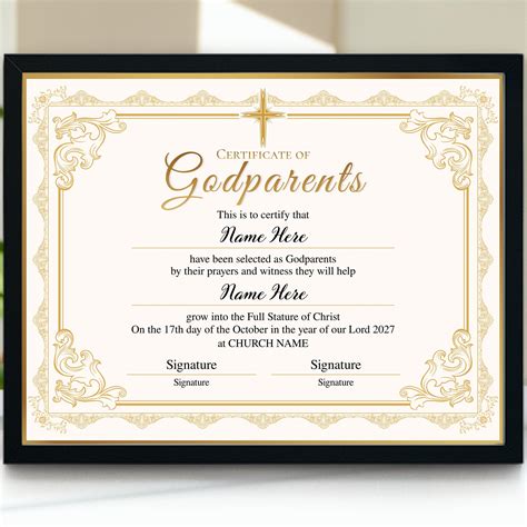 A godparent certificate is an important document that confirms a person's role as a godparent. It provides proof of their commitment and can be used for various purposes. If you are chosen to be a godparent, be sure to understand the requirements set by the church or religious organization and fulfill your duties to the best of your ability.